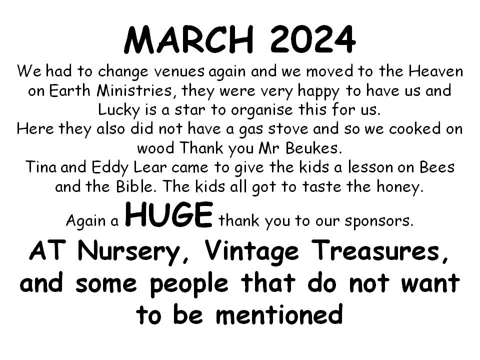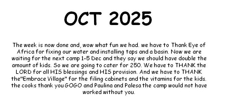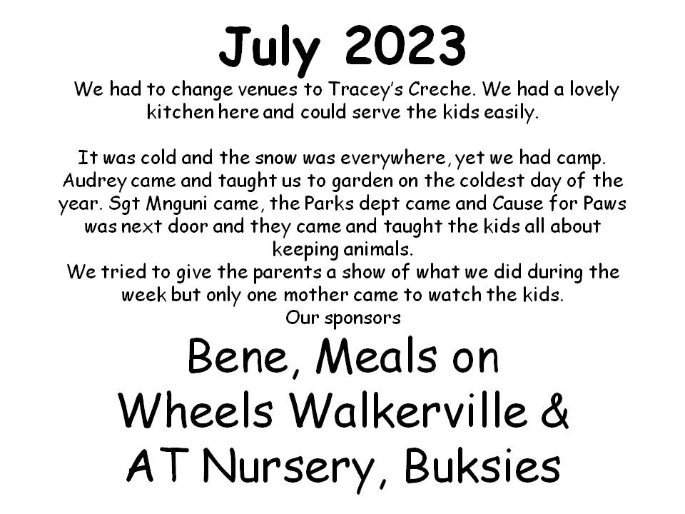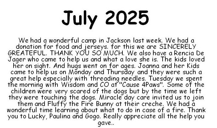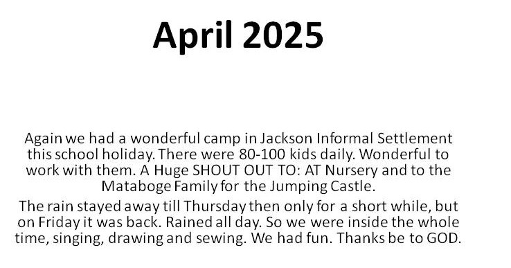 We are a Christian Holiday camp in Jackson Informal Settlement, We want to give each child a fun opportunity to grow in Christ and become a better person, by learning how to care for others, animals and the environment.